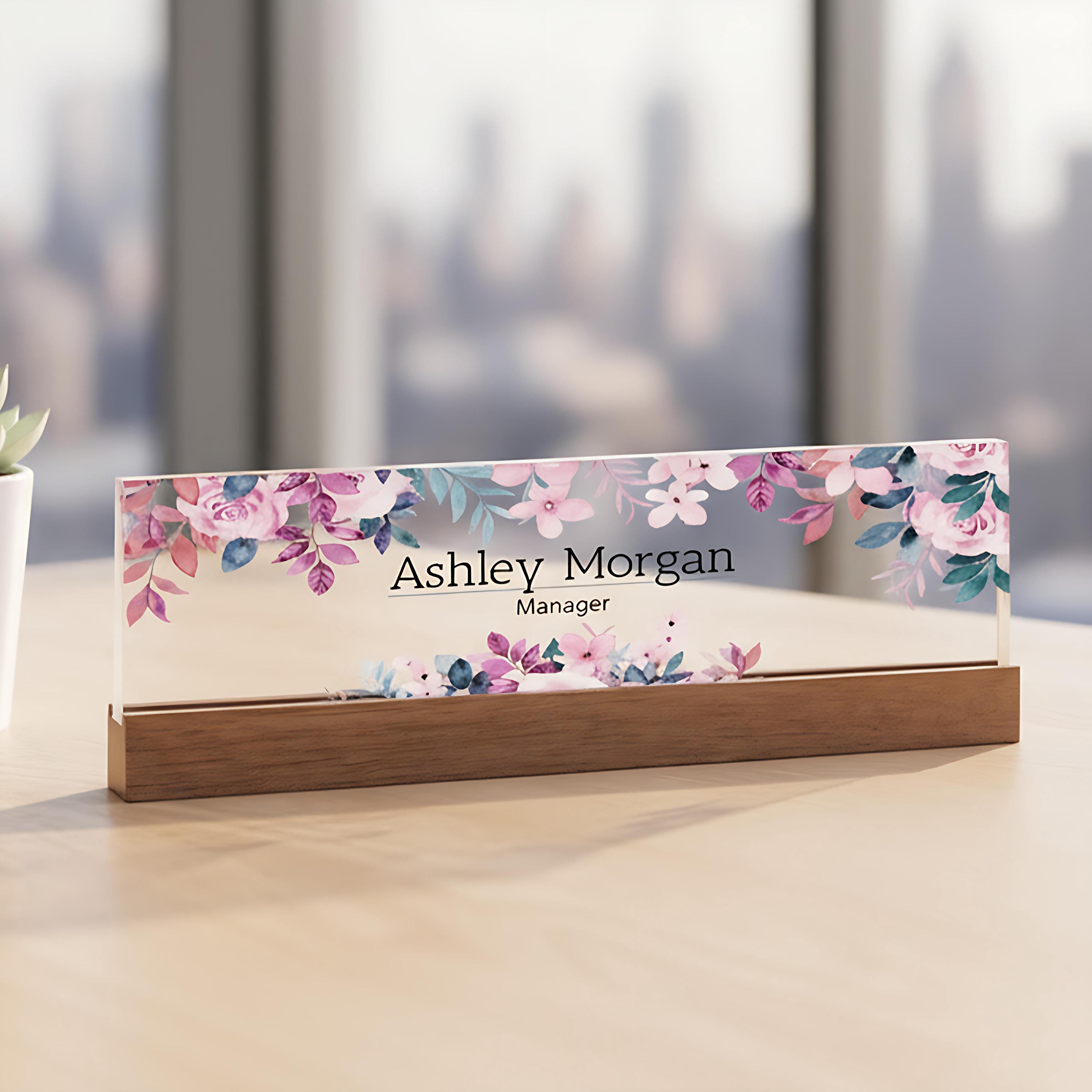 Personalized Acrylic Desk Nameplate: Floral Office Decor