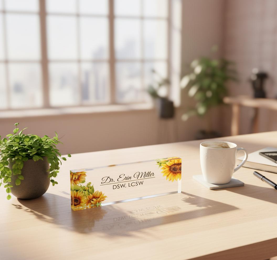Personalized Sunflower Desk Name Plate: Clear Acrylic Office Decor