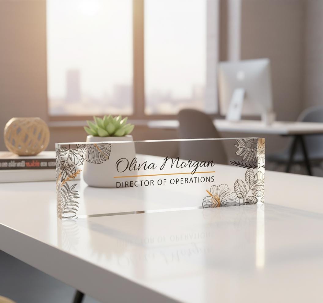 PERSONALIZED DESK NAME PLAQUE: Each acrylic desk name plaque is a unique, personalized piece that adds a professional touch to any workspace. Customers can customize their plaque with their name and title, making it truly their own.