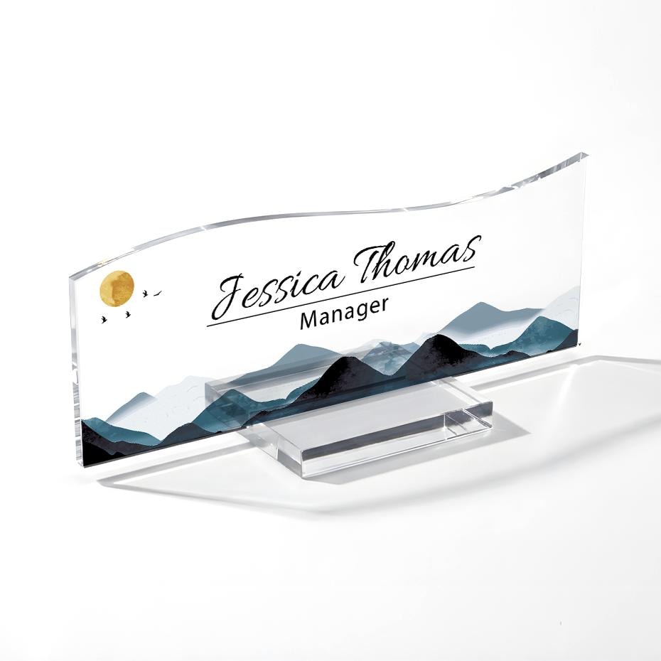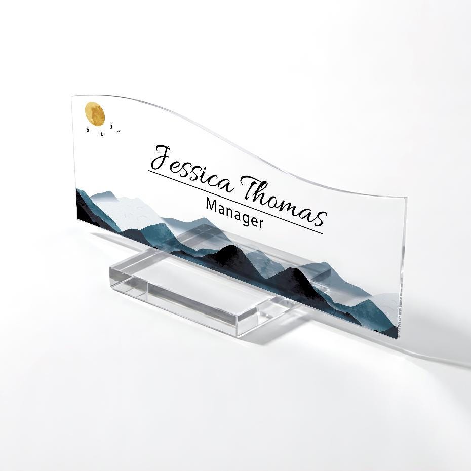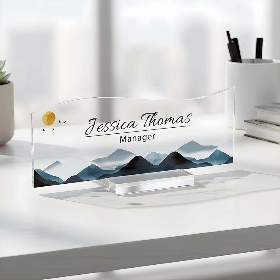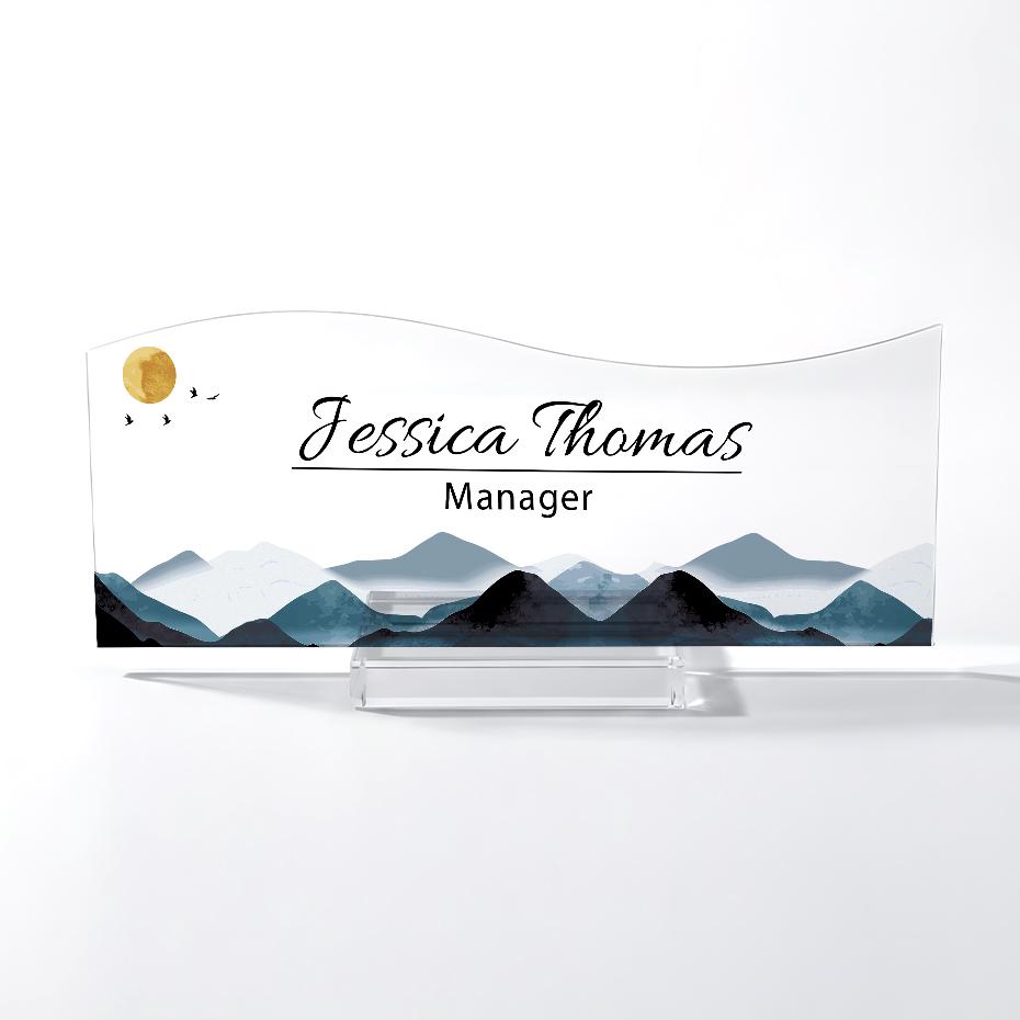 Personalized Acrylic Name Plate for Desk, Custom Office Decor Plate with Name and Position, Mountain Name Sign Acrylic Plaque, Office Decor